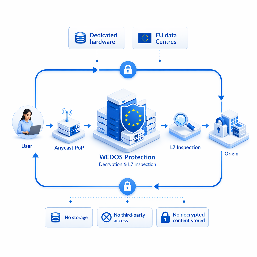 Bei WEDOS Protection erfolgt die Entschlüsselung ausschließlich auf dedizierter Hardware in zertifizierten EU-Rechenzentren, isoliert von gemeinsam genutzten Workloads. Der Datenverkehr wird vor der Weiterleitung an den Ursprungsserver erneut verschlüsselt. Es werden keine entschlüsselten Inhalte gespeichert. Dritte haben keinen Zugriff auf den Entschlüsselungsprozess oder dessen Ergebnisse.